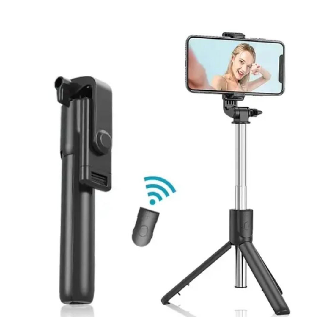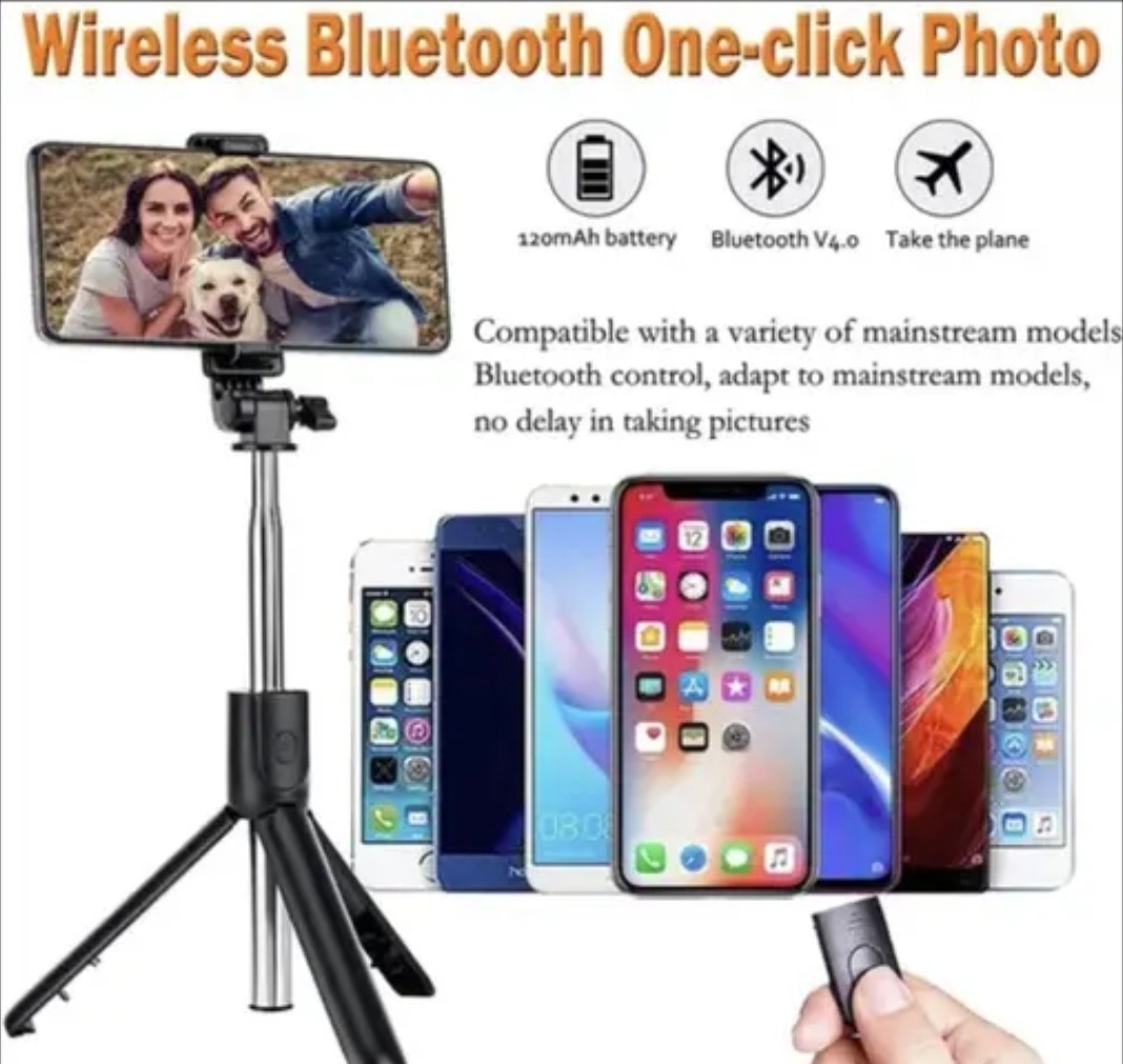 SELFISTUCK + TRIPOD 3 IN 1 SELFISTICKMulti-functional Design: Acts as a selfie stick, tripod, and phone holder all in one. Ideal for taking selfies, recording videos, or video calls. Telescopic Arm: Extendable stainless steel rod for adjustable height. Compact when folded, making it portable and travel-friendly. Detachable Bluetooth Remote: Wirelessly controls your phone's camera shutter. Enables hands-free photography from a distance. Compatible with both Android and iOS. Tripod Base: The legs unfold to become a stable tripod. Rubberized feet help maintain grip on flat surfaces. Adjustable Phone Mount: Rotates to accommodate both portrait and landscape modes. Securely holds various phone sizes. Best For: Content creators Vloggers Travel photography Group photos Online meetings or live streaming